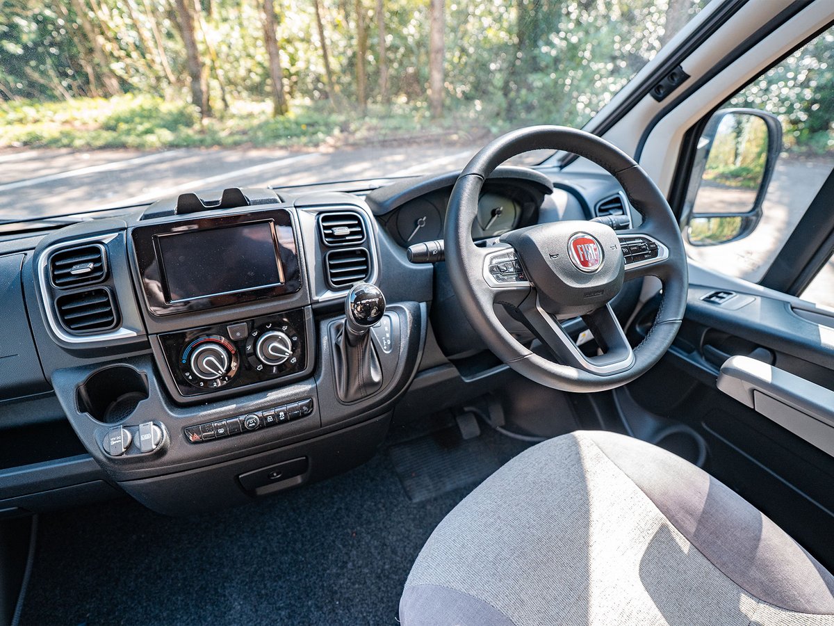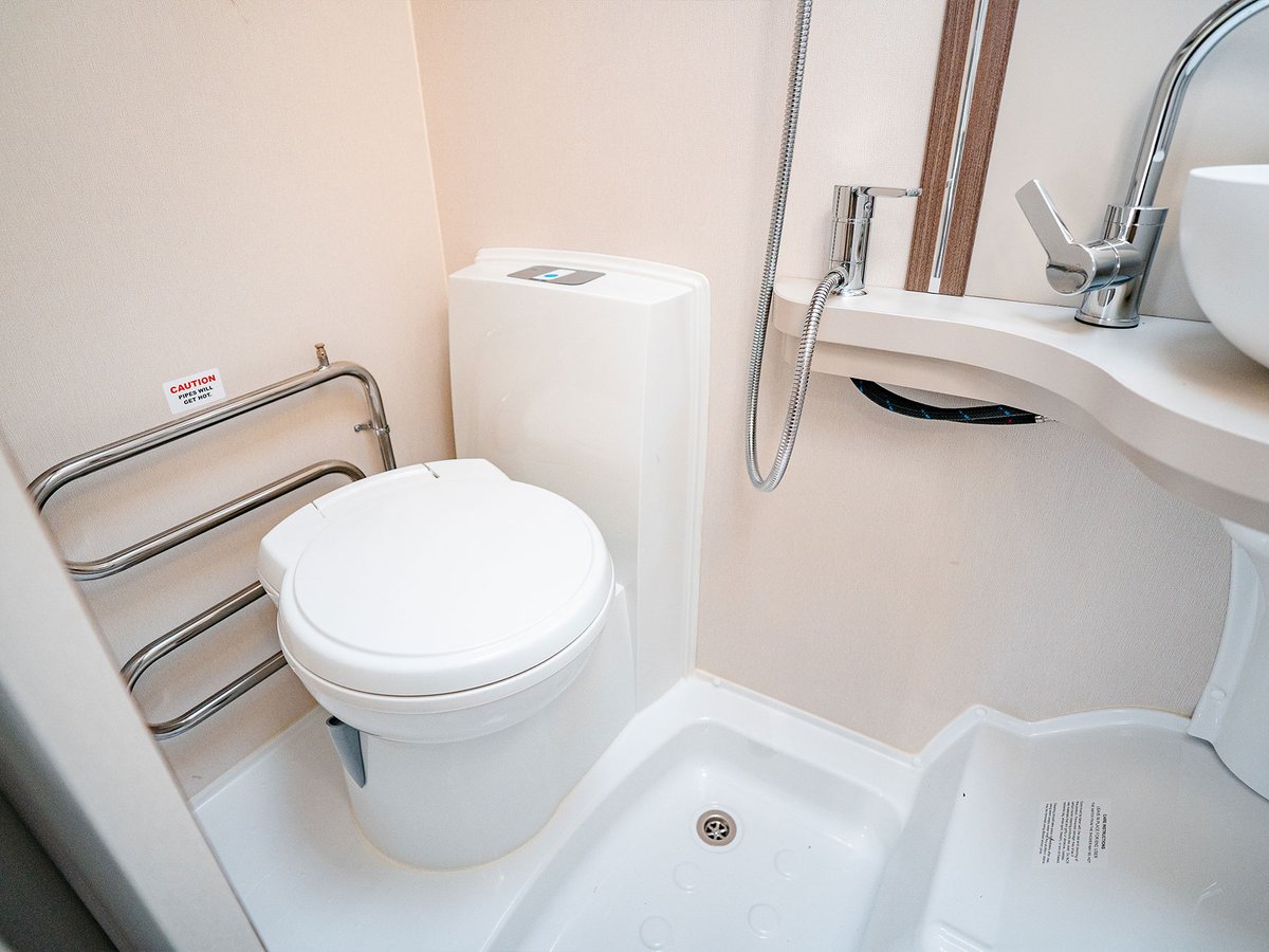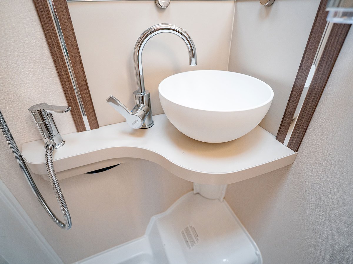 Inside you'll find a thoughtfully designed interior that combines comfort with practicality. The well-appointed kitchen features a Thetford cooker with three gas burners and an electric hotplate, a separate oven and grill, and a microwave, providing all the tools needed for preparing meals on the road. A tall fridge with a freezer compartment provides ample storage for fresh ingredients. The modern en-suite bathroom offers home-like convenience with a separate shower cubicle, a cassette toilet, and a washbasin. To keep you comfortable in all seasons, the Encore 250 is equipped with an Alde central and water heating system, ensuring a warm and cosy environment throughout your travels.