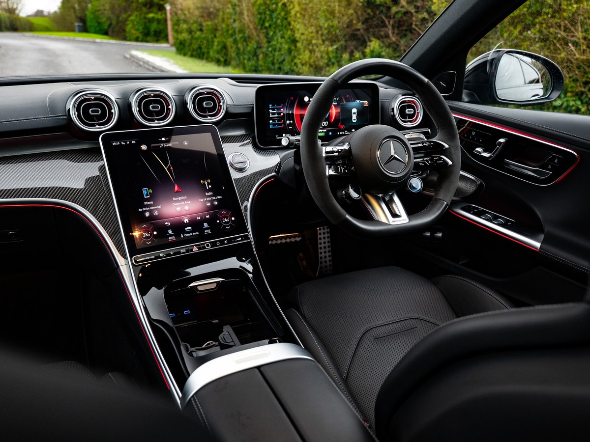 Step inside and you're surrounded by luxury and technology. The ebony leather AMG sports seats offer massage, four-way lumbar support, and a sculpted, race-inspired feel. while a panoramic glass roof brings in natural light.