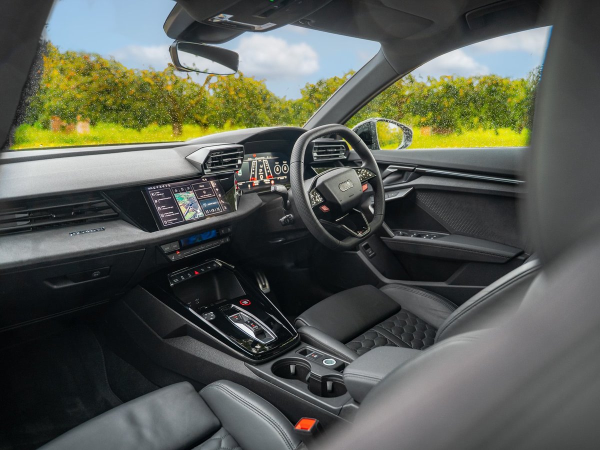 The Audi RS3 Saloon Quattro Black Edition is finished in striking Daytona Grey, perfectly complemented by a Fine Black Nappa leather interior featuring RS-embossed sports seats with black contrast stitching. Its aggressive styling is enhanced by 19” polished gloss black alloy wheels, a gloss black grille, and the black styling pack with black Audi rings for a bold, performance-driven appearance.