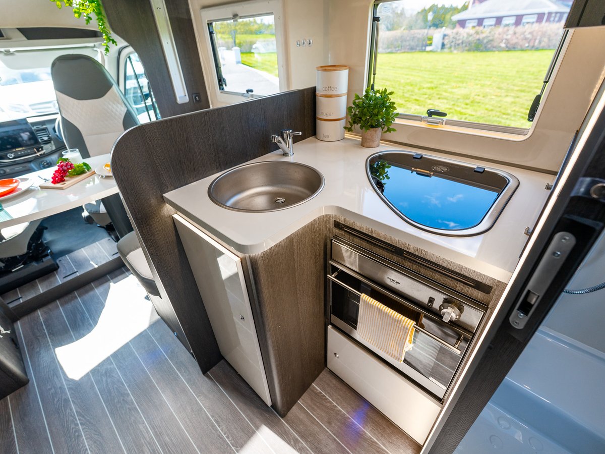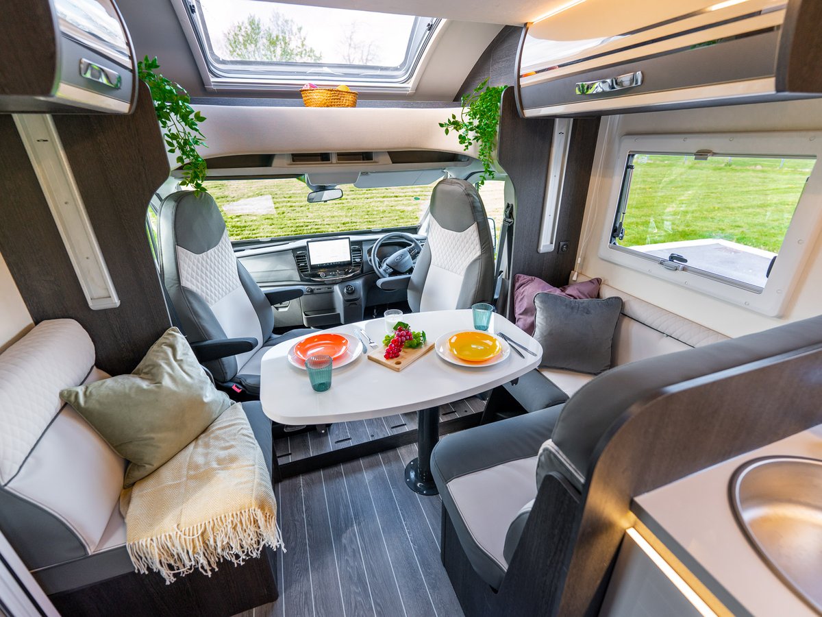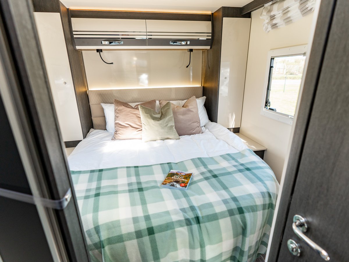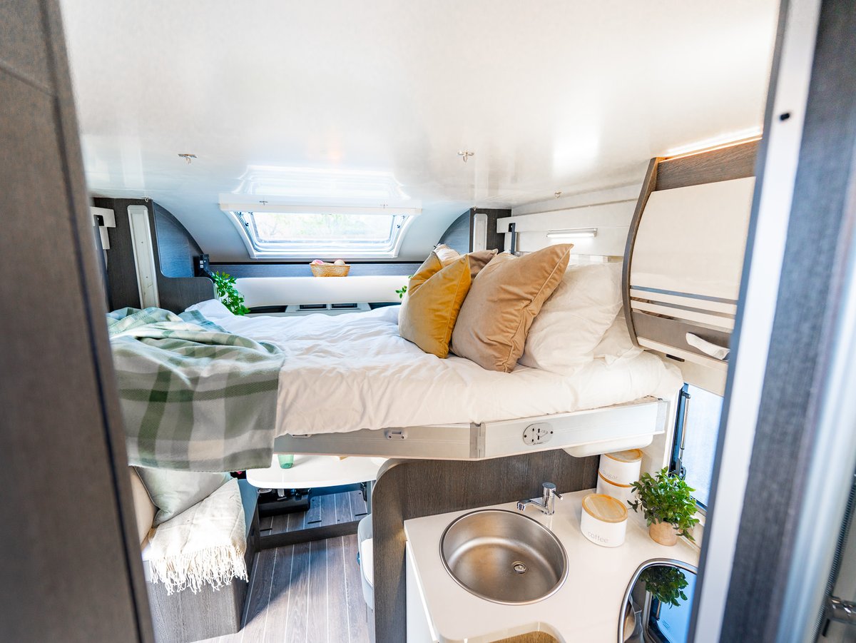 The rear island bed offers hotel-style comfort, while the electric drop-down bed and additional seating area allow up to five people to travel and sleep with ease.