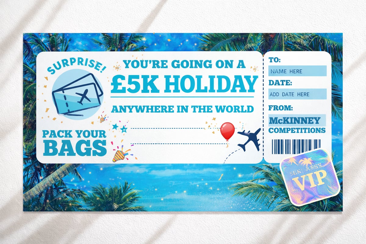 Win a £5,000 holiday voucher to use toward flights, luxury hotels, all-inclusive resorts, cruises, or once-in-a-lifetime experiences. Whether it’s tropical beaches, a city escape, a bucket-list adventure, or total relaxation — the choice is completely yours.