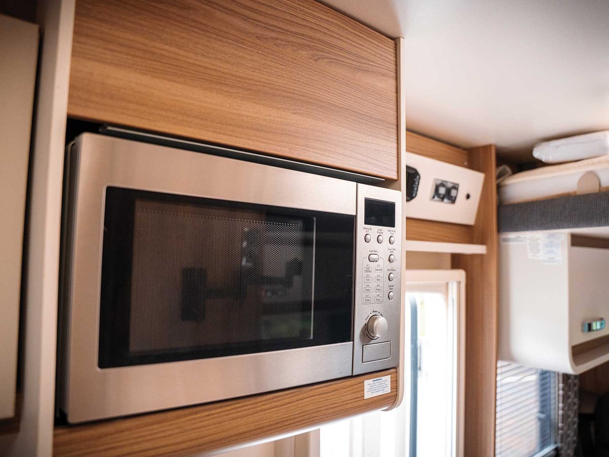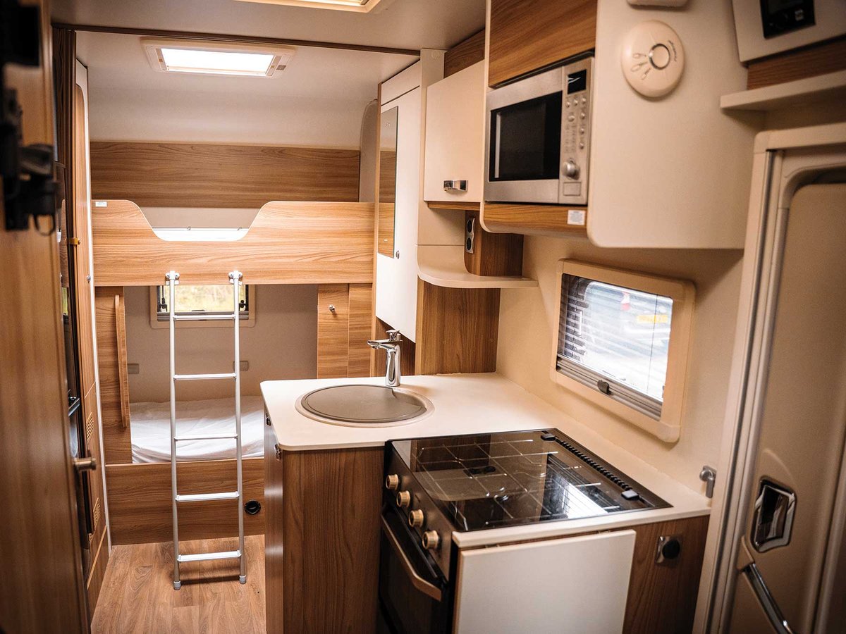 Inside, the Escape 695 transforms easily to accommodate six sleepers. At the rear, a pair of spacious transverse bunk beds offer plenty of room - and the lower bunk flips up to reveal a clever garage storage zone for bikes or camping gear. Up front, the dinette converts into a snug double bed, while above, a convenient drop-down double adds yet more sleeping space. This triple-bed setup makes it feel like home, whether you're a family on a road trip or a couple with guests.