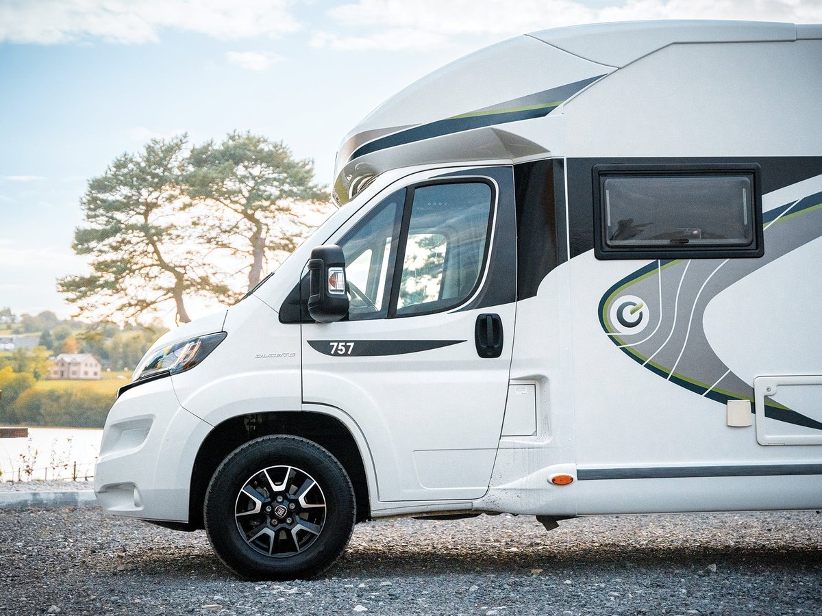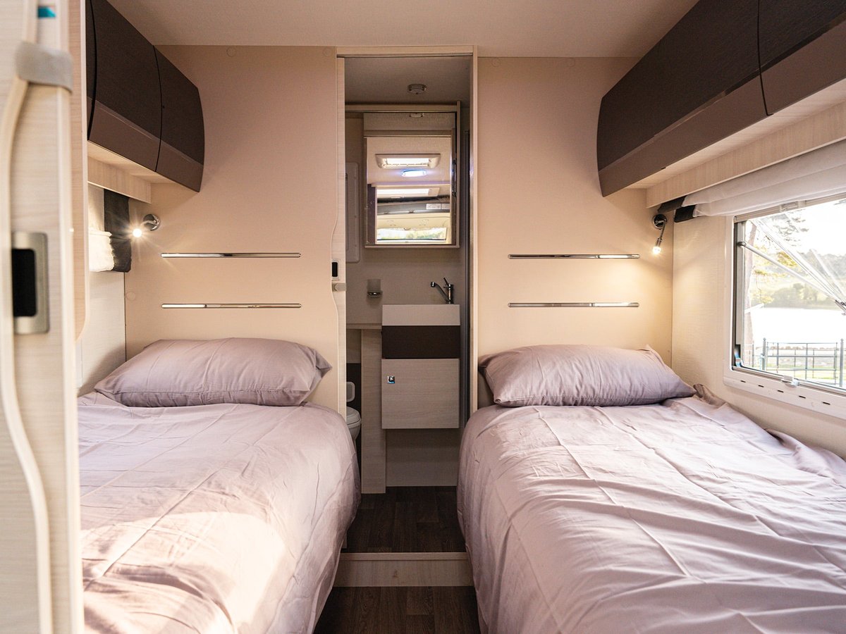 The Chausson 757 Welcome is a sleek, low-profile motorhome designed for four travellers. This premium model features generous twin single beds that lead to a rear washroom with a separate shower. The front lounge offers opposing sofas, swivel cabin seats, a retractable double bed, and two extra forward-facing travel seats for added convenience.