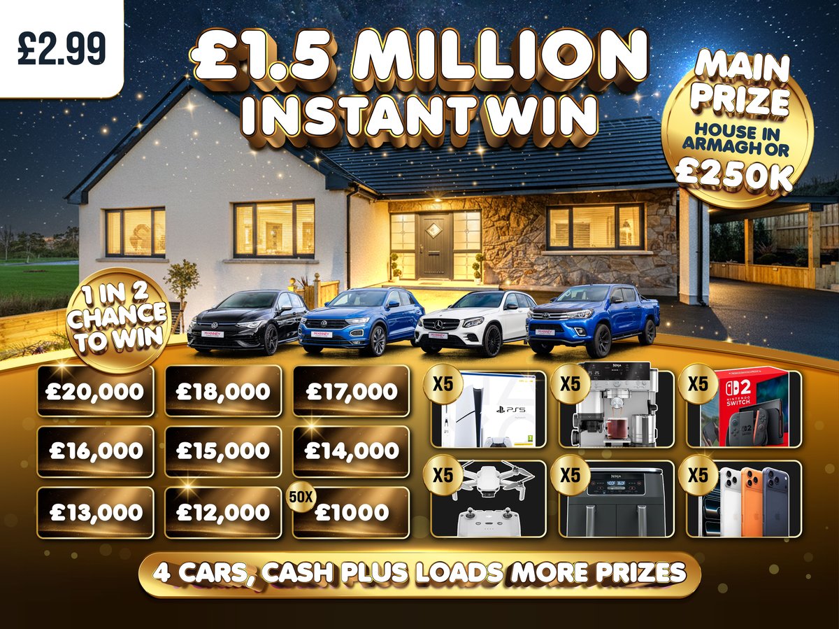 The ultimate prize in the MEGA £1.5 Million House Instant Win is a breathtaking 4-bedroom detached family home with a garage, located in a peaceful suburb of Armagh City.