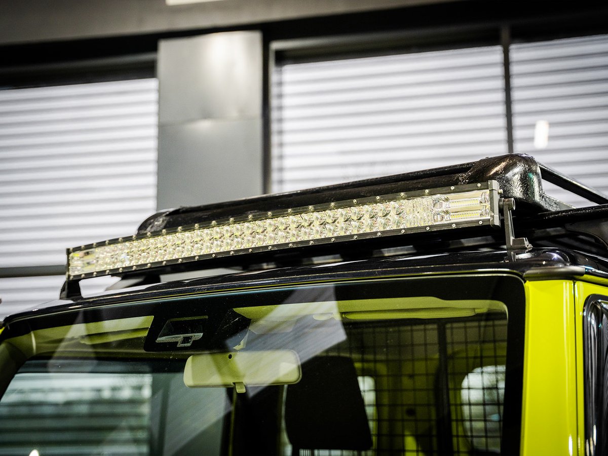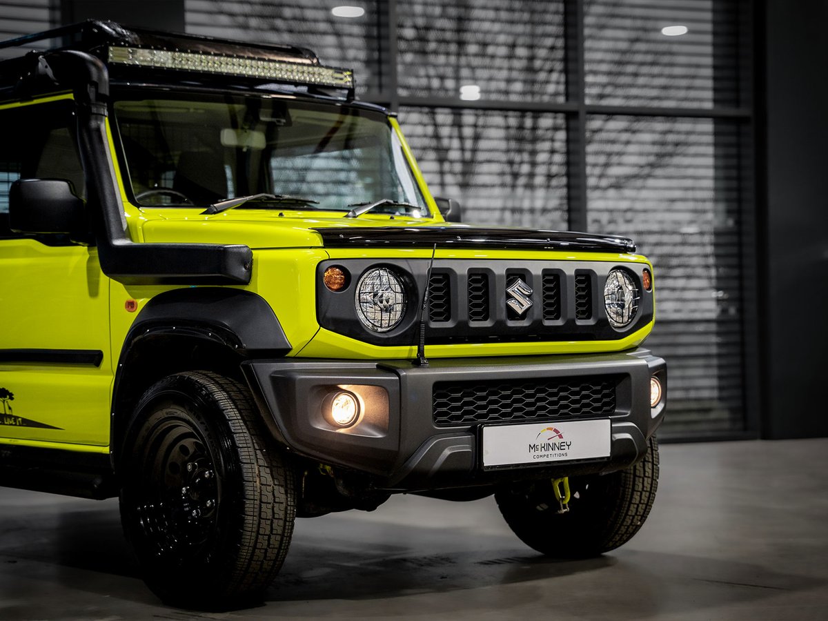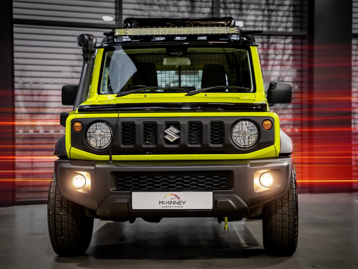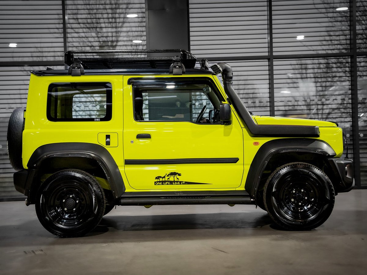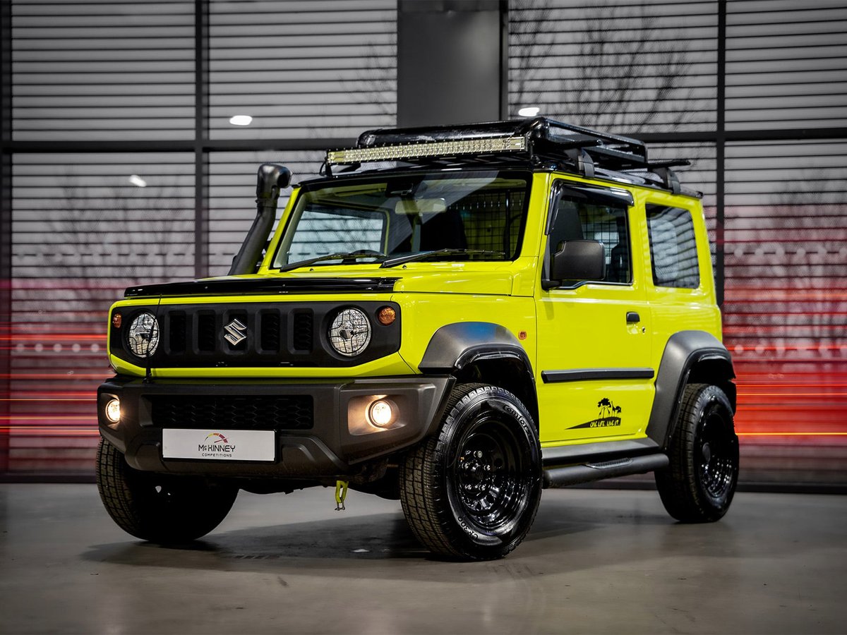 This isn't just any Jimny — it's been styled for adventure with bold upgrades including an aggressive exhaust pipe, rugged side steps and a roof-mounted light bar that looks incredible and is ready for the trails.